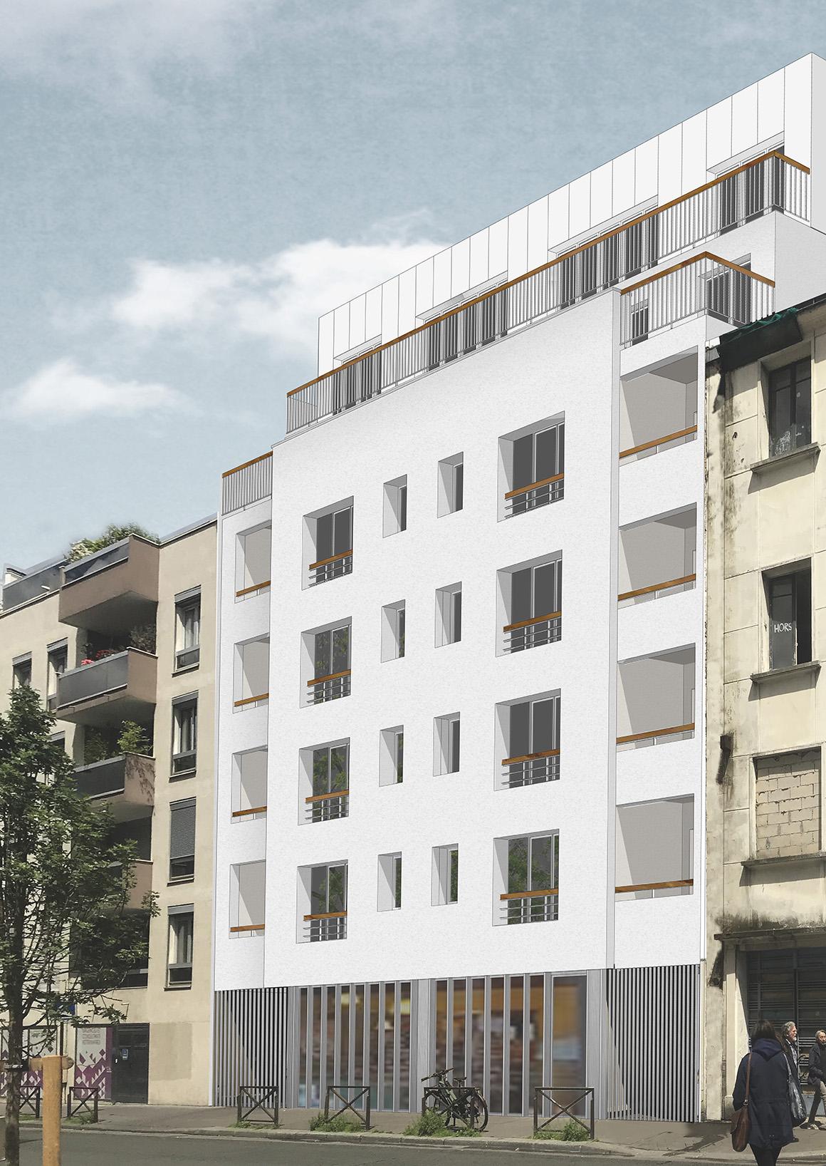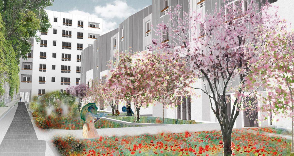 Les logements individuels situés en cœur d’ilot sont inscrits dans une logique architecturale de « barre » renforcée par une perception très homogène de l’ensemble. La densification par surélévation est l’occasion de restituer une individualité grâce à l’implantation des façades en léger débord ou en retrait, la création d’espaces extérieurs privatifs pour chaque logement existant ou créé et une alternance de teintes. Il s’agit de retrouver l’esprit de l’idéal de l’habitat ouvrier des années 30 très présent dans le quartier.