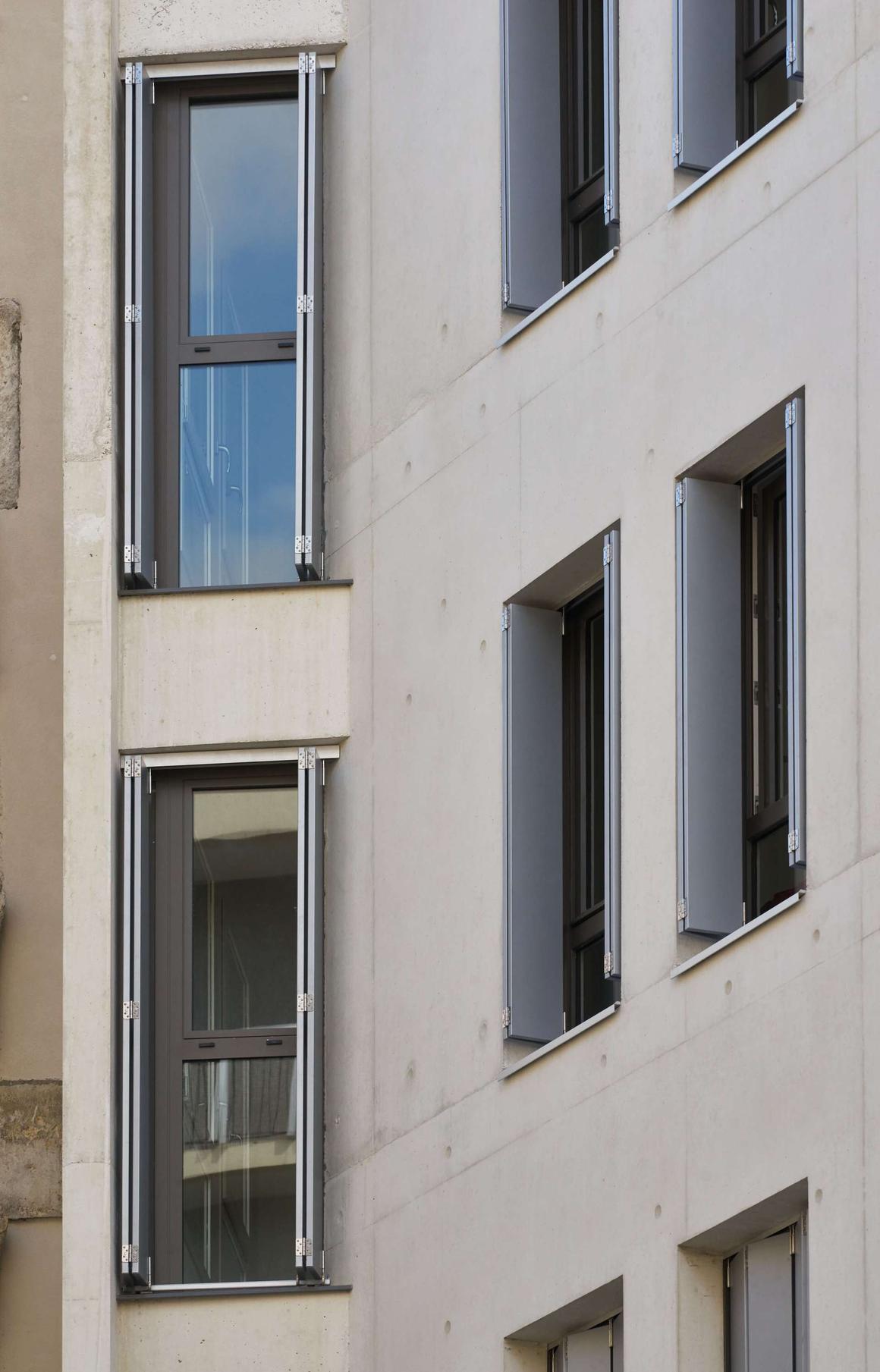 – les étages sont composés de béton blanc laissé brut de coffrage, la composition permet de capter le soleil de l’ouest