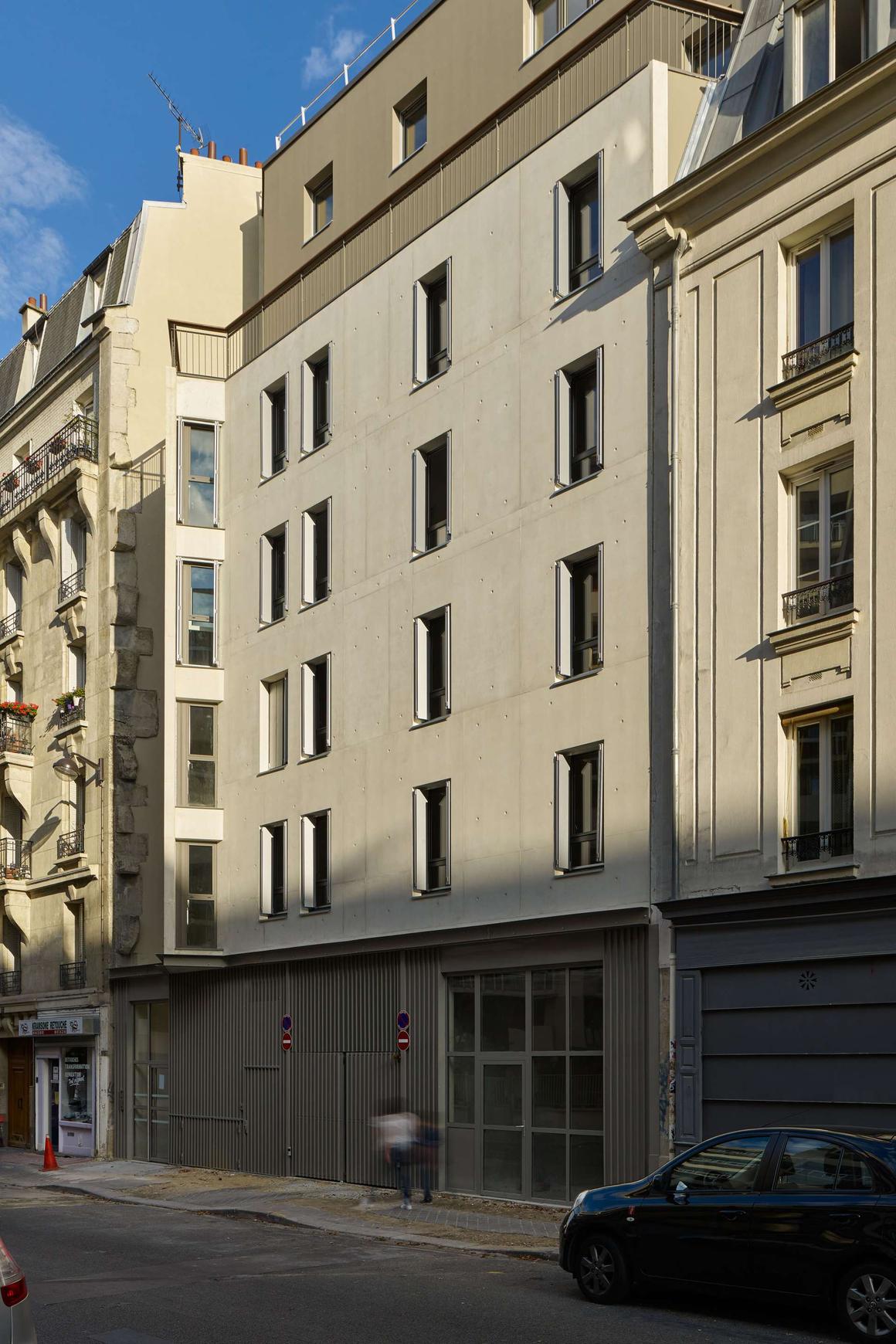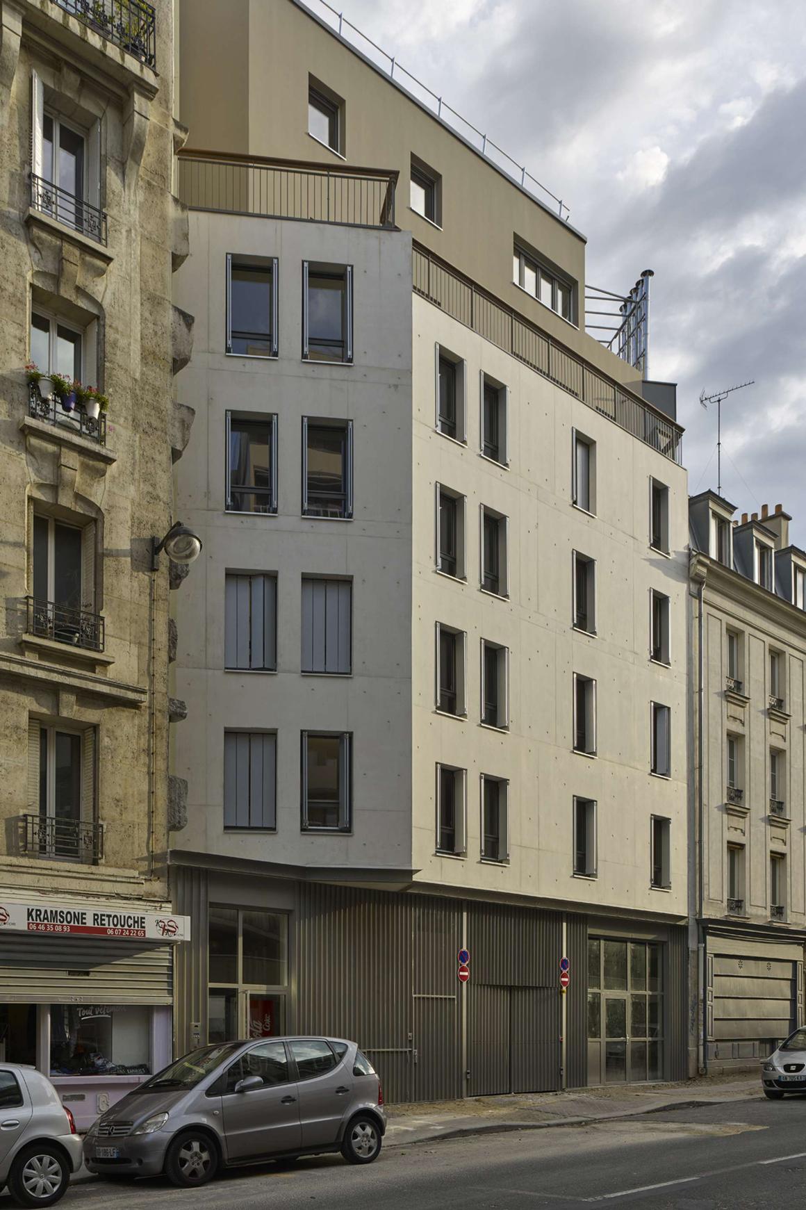 Sur la rue Championnet, le bâtiment est une nouvelle séquence qui reprend la logique des constructions voisines: