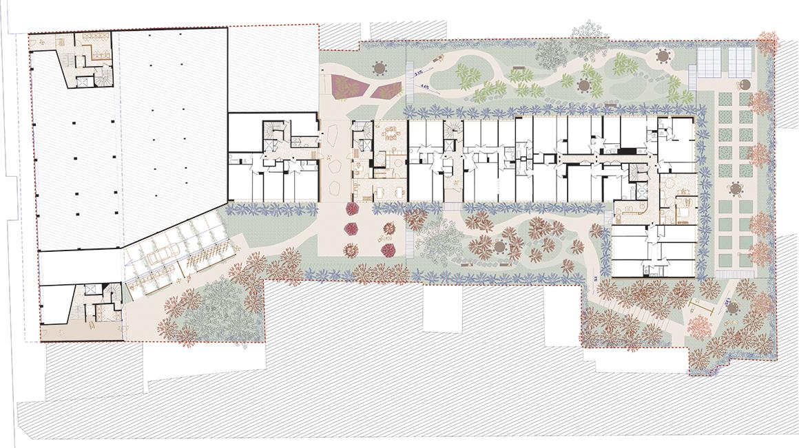Chaque espace particulier est pensé afin d’amplifier ses potentiels et accompagner le quotidien des habitants : l’entrée végétale, la place d’accueil, le jardin flamboyant, le bosquet des jeux, le potager des sauges, le verger automnal.