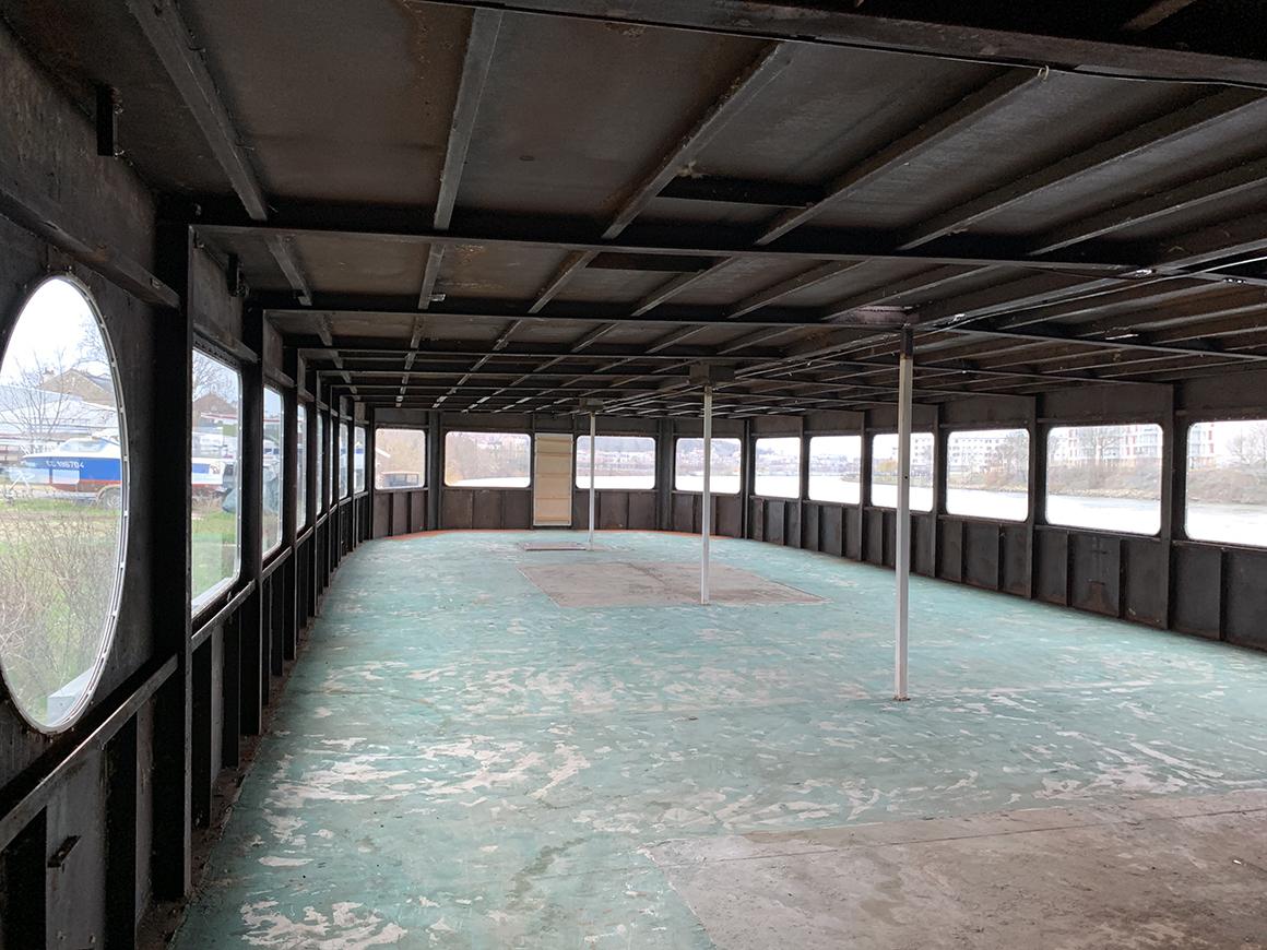Les espaces partagés intérieurs: le plan des espaces du pont supérieur est orienté suivant le paysage : les espaces de service côté quai, les espaces modulables côté Seine. Vers la proue : les espaces calmes, vers la poupe la salle à manger et la cuisine.
