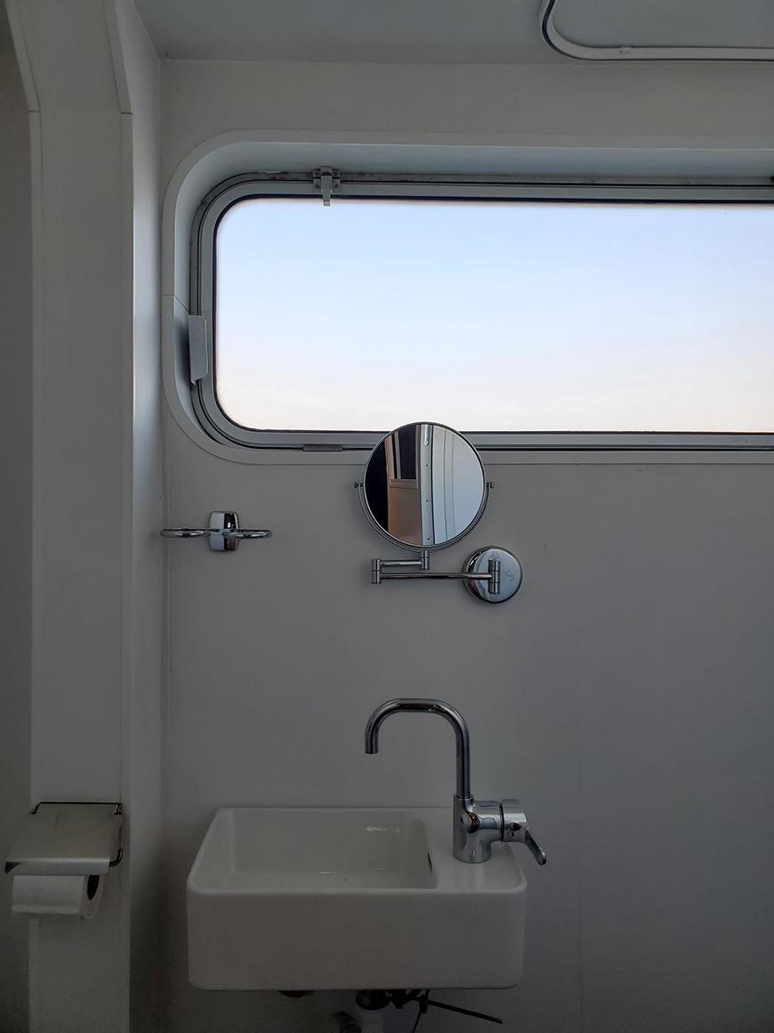 Les espaces privés: chacun des types est aménagé suivant un même dispositif permettant d’optimiser les petits espaces disponibles: la salle d’eau est aménagée côté hublot, séparée de la chambre par une cloison partiellement translucide, chaque couchette (190×70) possède une tête de lit comportant des niches de rangement, un éclairage de lecture et peut être close par un rideau, l’entrée comporte de grands rangements.