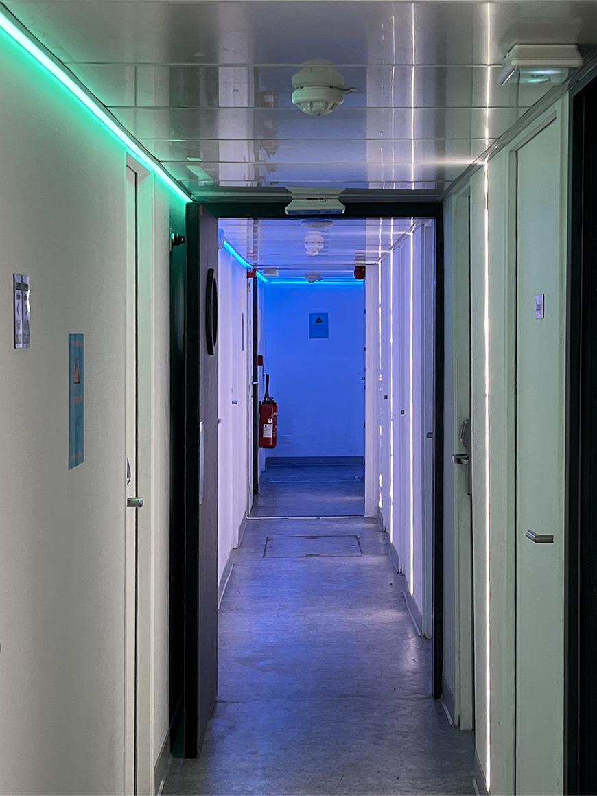 Les 35 cabines sont principalement localisées au niveau du pont inférieur, les espaces partagés, fixes ou modulables au niveau du pont supérieur, le pont terrasse est réservé aux activités de repos, de gymnastique, de jardinage.
