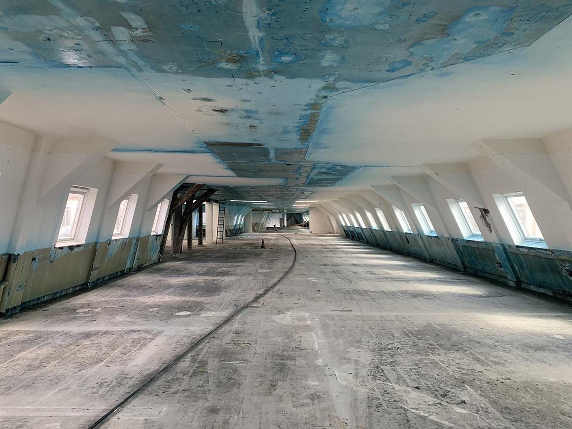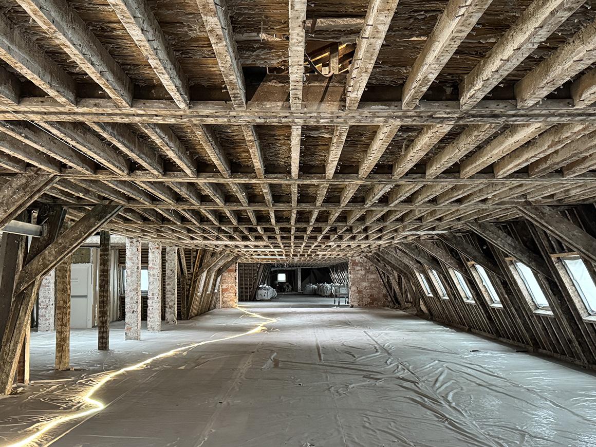 Le curage préalable à la réhabilitation du 5ème étage sous les combles a révélé une charpente en bois d’origine.