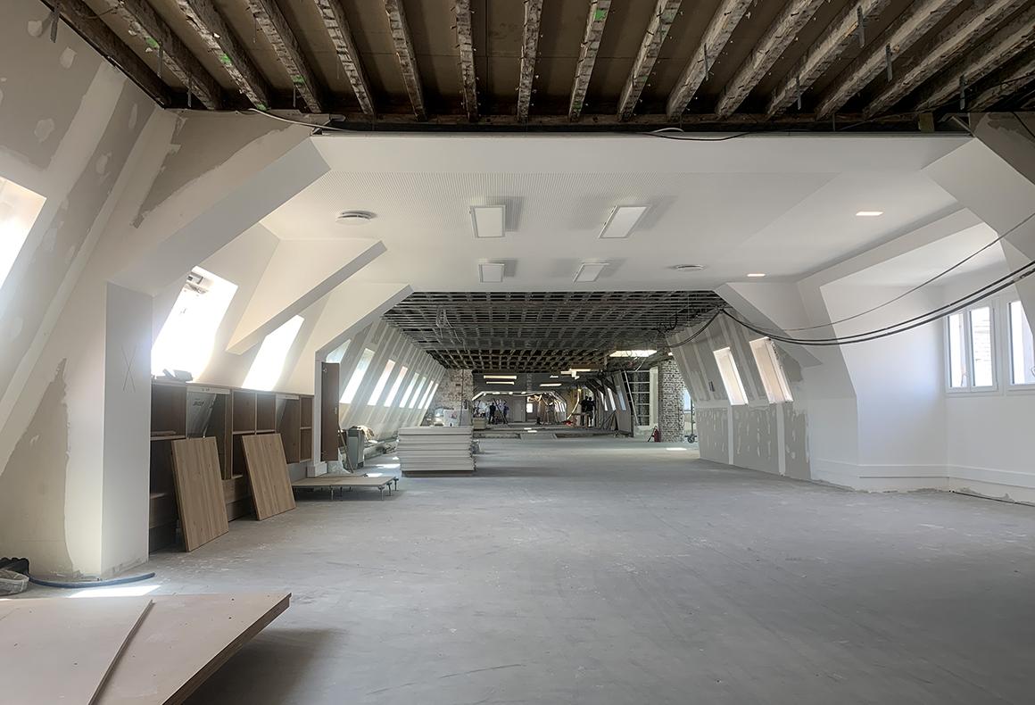 De nombreux châssis de toit assurent l’éclairage naturel de l’espace et sont autant de points de vue extraordinaire sur les toits de Paris. Les verrières existantes sont remplacées.