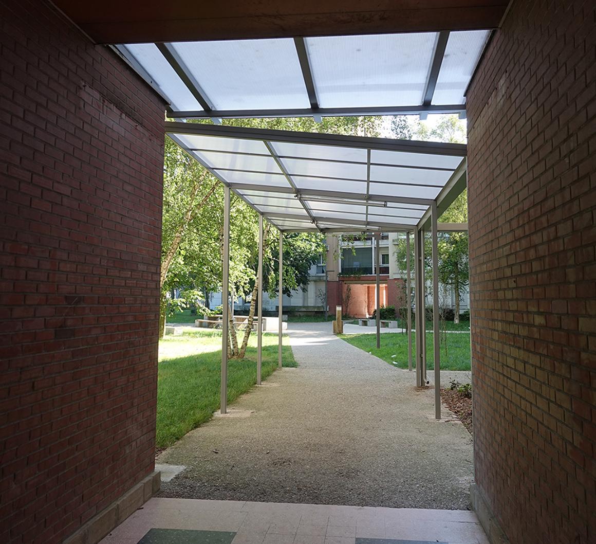 Les aménagements des parcours couverts : la mémoire des parcours interrompus est révélée par les «boites à lumière», les auvents sont remplacés par des éléments inspirés des dessins de l’architecte Honegger.