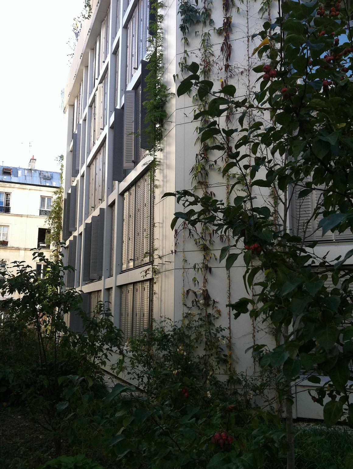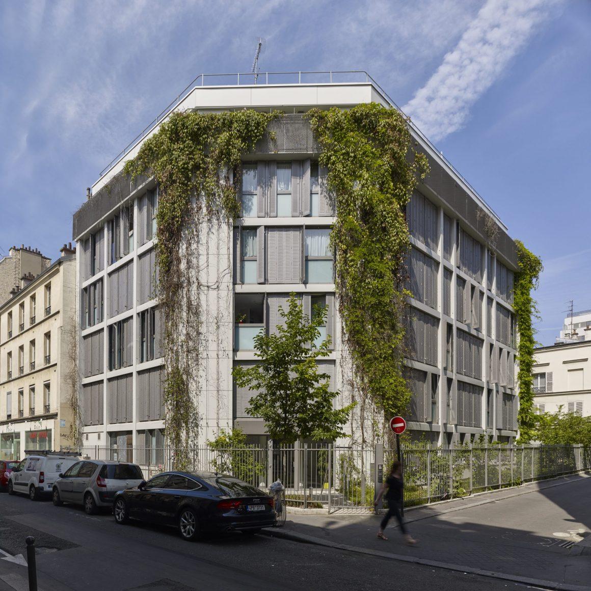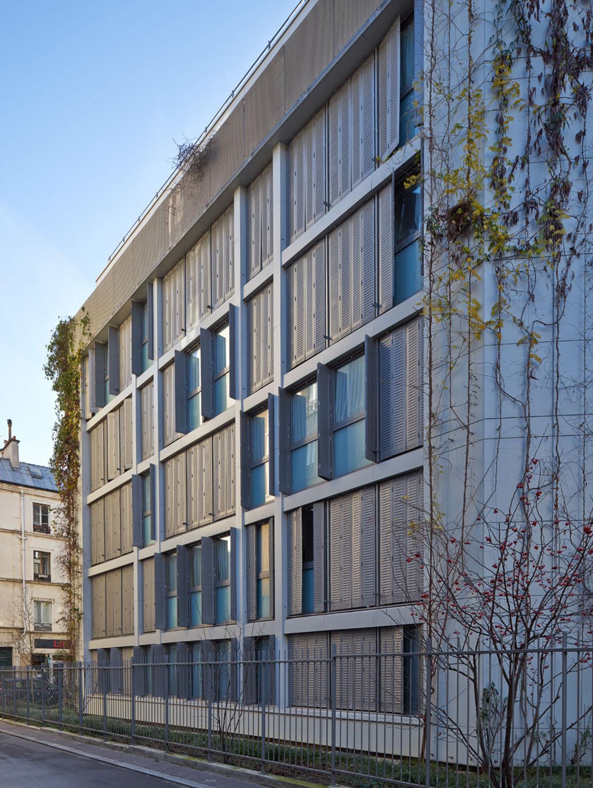 Chaque élément du contexte est utilisé, amplifié ou détourné afin d’intégrer le bâtiment dans son quartier: transformation des stationnements automobiles en jardins de pleine terre, préservation de la trame structurelle de la façade animée par des persiennes « parisiennes », végétalisation des façades (clin d’oeil au seul arbre de la rue présent sur le site avant les travaux).