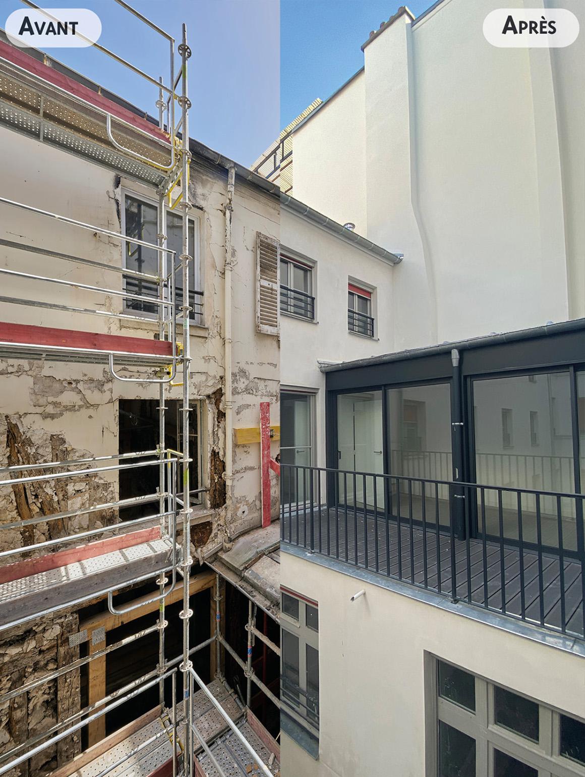 La parcelle est bordée par la rue Meslay au Nord et par 3 parcelles mitoyennes au Sud à l’Est et à l’Ouest comportant chacun des immeubles et construction diverses. Les constructions existantes sur la parcelle sont prévues conservées et réhabilitées. Aucune démolition n’est prévue. Seul le bâtiment en fond de cour sera partiellement surélevé.